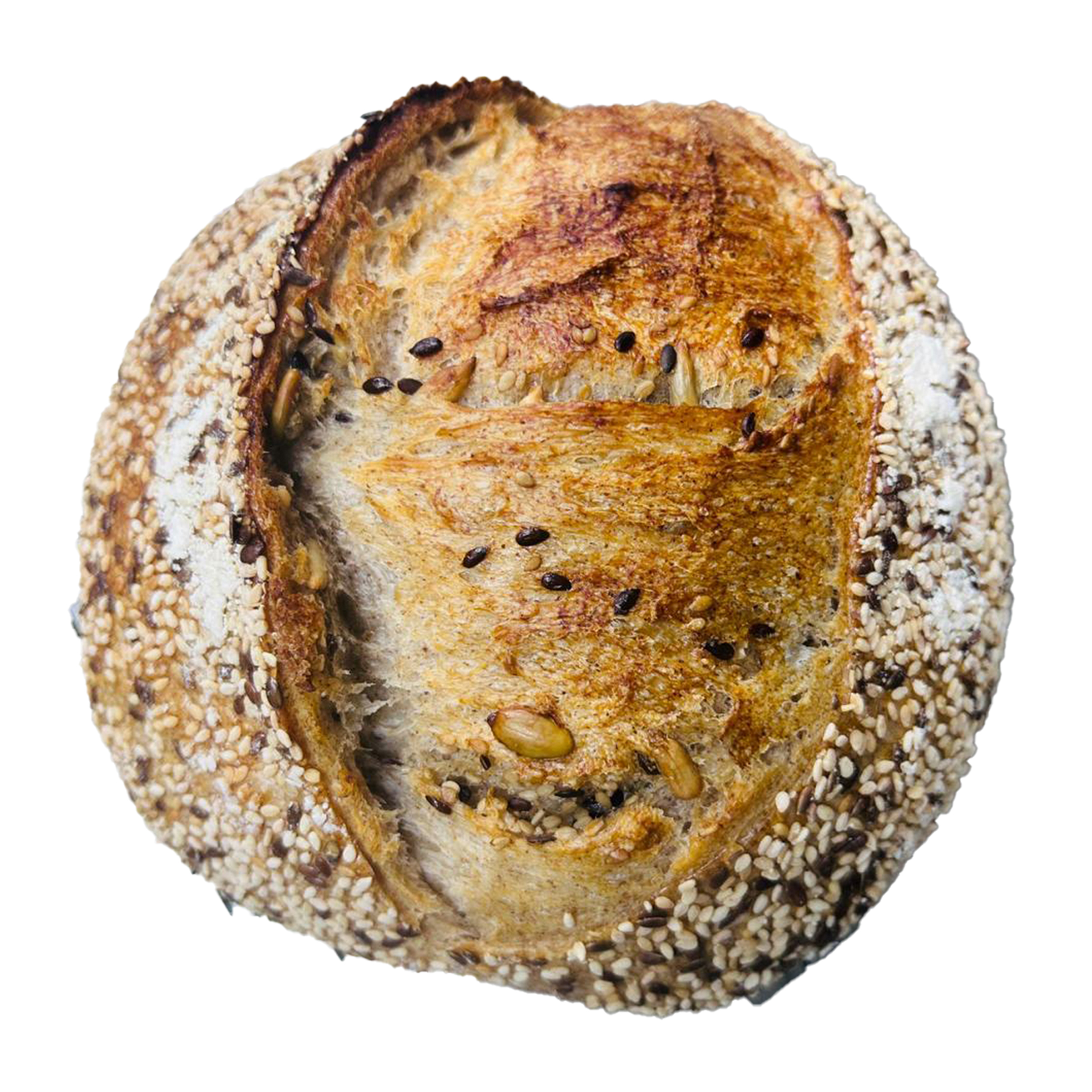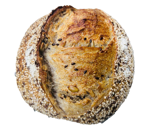 Our bread is naturally leavened with a wild sourdough starter and slow-fermented for 12–24 hours. This traditional process enhances flavor, improves digestibility, and requires no commercial yeast or preservatives.